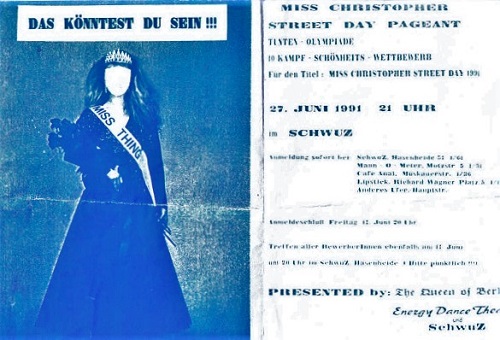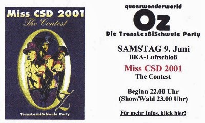 Miss CSD 1991 organisiert von Kenny, Queen of Berlin - Dame Tima mit Jury-MitgliederIn BeV (s.o. re./ Foto: Aaron Neubert), Jürgen Baldiga und Wieland Speck Nach 10 Jahren: Miss CSD 2001 Gewonnen hat eine lesbische Tunte: Frl. Kaiserin! ![]() ![]() ![]() BKA Luftschloß - Moderation Miss CSD`91 Frl. Debbie (Chrille) - Bühne mit Showtreppe und Videoeinspielungen- Teilnehmerin Linda von Tennstedt mit "Farbfilm vergessen..." |
