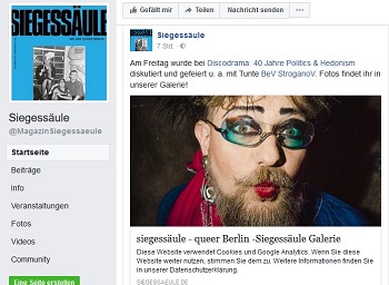 November![]() Ausstellung"Faszination Sex" zu Martin Dannecker / Bildmitte - Kuratorin Patsy / links ![]() ![]() Li: BeV & Kuratorin Patsy L´Amour la Love Re: BeV & Ulrike Oettinger im SchwuMu am 2.11.17. Mein erstes Filmkostüm war für ihren Film "7 Todsünden" 1984 Oktober![]() ![]() ![]() Li: BeV ganzseitig in der Siegessäule, Seite 4 / Foto: Rüdiger Trautsch aus Hamburg Mi.: Tuntenführung im Museum Re: BeV "Hallo Wien" - 40 Jahre SchwuZ am 30.10.17. ![]() ![]() "Geschichtsführung aus Tuntensicht" mit Bev im Schwules Museum* am 19.10.2017 Tunika passt toll zum Museums-Shirt / Fotos Axel Wippermann ![]() ![]() ![]() Bev im Roten Rathaus: Verleihung Freiwilligen Pass für Ehrenamtler am 24.10. - auch 5 Ehrenamtliche aus dem Schwulen Museum wurden geehrt (Aron war leider nicht da) ![]() ![]() Bev mit Stuart Feather im Schwulen Museum am 23.10. - Einige wollen in London ein "Queerseum" gründen! Re.: in den 70ern als "Gretel" bei den berühmten Bloolips !!!! ![]() ![]() ![]() Mi: Stuart Feather im "Ludwig" in Neukölln am 25.10. : Lesung aus seinem Buch über die Gay Liberation Front mit Aktionen von Tunten!!! Im Publikum: Peter und Stefan (Eisenherz-Buchladen-Gründer) amüsierten sich königlich.... ![]() ![]() Bev-Kostüme aktuell: Dr. Axel W. im Kleid auf der Polymorphia-Werbung und Gaby Tupper in meiner "roten Schleife" im TdW bei der AIDS-Gala. ![]() ![]() Einladungskarte 40 Jahre SchwuZ mit Spruch von Ovo (wie nett) Re: Filmemacher Michael Brynntrup sandte mir diese Werbung aus den 20er Jahren gerade zu - supi September![]() BeV mit Joachim Lange Nacht der Museen mit Tuntenführung im Schwulen Museum ![]() ![]() ![]() Neues Denkmal / Eröffnung mit viel Prominenz - ggb. des Kanzleramts / am Hirschfeldufer ![]() Tag des offenen Denkmals auf dem Alten St.-Matthäus-Kirchhof ![]() ![]() ![]() Li: BeV ganz auf Römisch (mit Sigrid Grajek) Am 29.9. gab es ein Podium im SchwuZ: "Früher war alles besser...?" Frage: wann war früher? Film von Jochen Hick mit einigen Bildern von mir.... re.: Ladies Neid 2 Dez. 1985 ![]() ![]() SiS Facebook und Galerie: Hatte was vom letzten Abendmahl... ![]() ![]() Fotos: Rüdiger Trautsch für Ausstellungsprojekt (siehe auch Foto "Ledermaske" oben) |
