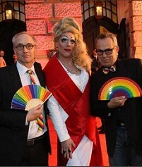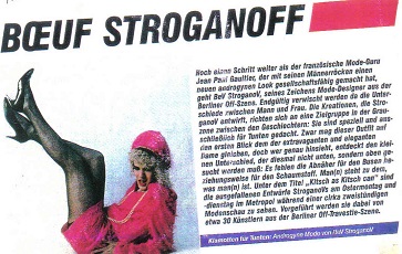 ![]() ![]() 10. März: Friedrichstadtpalast - große Show mit Gaultier-Kostümen - und mit tollen Haaren - und ESC-Sänger Roman Lob (s.u.) ![]() ![]() ![]() ![]() Am Eingang Regenbogenfarben und auch im U-Bahnhof bunte Lichter >> palast.berlin/de/respect ![]() ![]() Damals wars.... ![]() 1989 im TIP: Noch einen Schritt weiter als der Mode-Guru Gaultier geht BeV StroganoV..... (Presse zu Modenschau "Kitsch as Kitsch can" im Metropol Berlin) März 2017 ![]() ![]() ![]() ![]() Am Nolli, Mit Gaby bei Vernissage, Neu: Klavier für 5 € vom Flohmarkt (Juhu), bepflastert im Nacken ![]() >> Youtube: BeV im Radiointerview 26.3.2017 Noch bis zum 1.5.2017 Installation zu Ovo Maltine im Schwulen Museum* ![]() ![]() Ovo starb im Februar 2005 - sein heilender Altar ist nun Teil einer Ausstellung (bis 16.4.2017) >> Ovo Website > Sonderseite Schwules Museum > facebook Video Schwules Museum Gabi Tuppert und Tima zu Ovo-Installation ![]() www.kenb.org Startseite ![]() >> bevstroganov.wix.com/tuntenmuseum www.kenb.org/Tuntenmuseum Intro BeVs animierte Tuntensite mit Links zu youtube & Sonderseiten Website von BeV StroganoV mit Links ![]() BeV trägt den braunen Cordanzug, den Wieland über Jahre bei jeder Berlinale trug :-) |