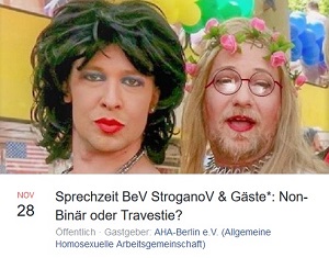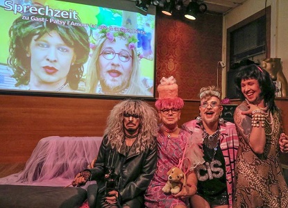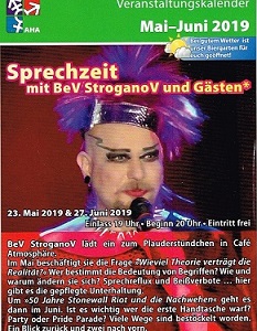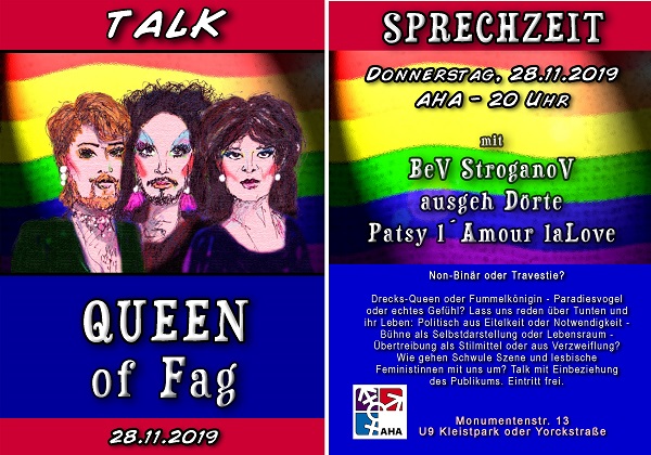 CSD Berlin 2019![]() Hippie BeV wie 1969 mit Axel Sprechzeitmit BeV StroganoV und Gäst*innenDonnerstag, 30.1.2020 - 20 Uhr Tunten und Kunst - wie drücken wir uns aus? Mit Künstler Cihangir Gümüstürkmen sowie Hildegard und Baffi von TfD (Travestie für Deutschland) >> art-of-cihangir.de/kunst/malerei/ >> travestie-fuer-deutschland.org/ ![]() ![]() ![]() ![]() Ein Talk den ich nicht so nennen möchte. 23.5.19 , 20 Uhr in der AHA, Monumentenstr. 13 Thema: Wieviel (feministische) Theorie verträgt die Realität? ![]() Tunten sind Transgender BeV und Gäste Kaey und Brigitte Oytoy am 23. Mai: Herzlichen Dank - ihr habt mir das "erste Mal" leicht gemacht. Foto: Axel Wippermann Sprechzeit 27.6.19, 20 Uhr Thema: "Stonewall Riot" und die Nachwehen ![]() BeV singt "Geh die Strasse..." Cindy & Bert, Gästinnen*: Gaby Tupper und Angela Schmerfeld (megadykes & CSD 2019) Fotos: Rudolf R. Sprechzeit 27.6.19, 20 Uhr Thema: "Tunten und Sex" und Hot Peaches Lasst uns mal reden: Tunten & Sex – Zu kerlig für Trans* und zu weiblich für die Szene? Tunten haben als gerne schwule Männer Begierden, die nicht mit dem übertrieben dargestelltem Frauenbild zu tun haben. Wie verschieden sind die sexuellen Wünsche und wie reagieren die begehrten möglichen Partner? Der alte Begriff Homophil steht für die emotionale Beziehung – nicht immer steht nur der Sex im Vordergrund bei Schwulen. Tunte sein ist auch eine emotionale Sache – sieht das sexuelle Ausleben anders aus? Wir wollen mal drüber reden … ![]() Foto: Axel Wippermann Jimmy, Peter Rausch (Sonntagsclub), Jurrasica Parka, BeV ![]() >> Veranstaltung bei AHA Facebook - zum teilen ![]() Eine lange Verbindung zur AHA: Kaspar & BeV 1986 in der AHA Friedrichstrasse ![]() TGIF: BeV als Gast bei Gaby mit Mabel Thema: International Crisys von den Hot Peaches NY ![]() Durch Zufall gerade gefunden: Crisys (li.) mit den Hot Peaches in der AIDS-Station AVK 1988 ![]() BeV & Jimmy Camicia von den "Hot Peaches NY" 2019 |