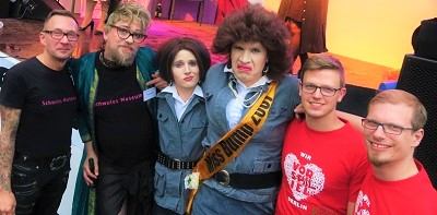 ![]() ![]() Foto Werbepostkarte von Annette Frick / Peter & Freund bei Wigstöckel im BKA-Luftschloß 2001 re.: Blick durchs Fenster des Museums in die Ausstellung - linke Wand: Bilder vom Film "Einstein des Sex" (Magnus Hirschfeld) Ausstellung Schwules Museum*: "Ein ostwest-deutsches Leben" 16. 7. 2016 - 17.10.2016 Peter Kothe (8. Juli 1939 - 23. August 2015) Bühnen- & Filmausstatter / 1984 aus der DDR ausgewiesen ![]() ![]() Ausstellungseröffnung Freitag, 15. Juli 2016 mit Wolfgang Theiss und vielen Freunden & Familie von Peter Kothe (in dem Raum von "Millionaires...") ![]() ![]() Zu Gast: Regisseur Rosa von Praunheim & Freund vor Installation zum Film "Ich bin meine eigene Frau" (Charlotte von Mahlsdorf) Geena & BeV StroganoV kennen sich schon von gemeinsamen Shows seit 1985 Am 13. Juli 2016 machten wir mit eine amerikanischen Praktikantin eine von ihr erabeiteten Führung im historischen queeren Berlin mit aktuellen Bezügen: Es ging vom Schwulen Museum* vorbei an BAH, Nolli und ehem. Bar Eldorado zum Haus von Christopher Isherwood. ![]() ![]() ![]() Sorry: "Elledorado" ist natürlich der heutige Spendenverein - ELDORADO war ein Lokal bis 1933.... ![]() ![]() Nollendorfstraße 17 - Wohnort Isherwood 1929-1933 20. November: Jubiläum "50 Jahre Musical Cabaret" - Uraufführung am Broadway, NY 1966: mit Joel Grey als Conferencier & Lotte Lenya als Vermieterin Frl. Schneider. Im Film 1972 war diese Rolle leider kaum vorhanden. ![]() Kurt Weills Frau Lotte Lenya / 1898 - 1981 (die berümhmteste "Seräuber Jenny") 1962 erhielt sie eine Oscar-Nominierung als Suporting Actress (neben Vivien Leigh) und Nominierung für Golden Globe BeV hat 1993 & 1997 für das Musical Cabaret im Schmidt´s Tivoli HH die Kostüme gemacht > Kostüme von BeV Hinweis ![]() ![]() Märkisches Museum: Nollendorfplatz im Licht 1909 & Ernst Ludwig Kirchner: Nollendorfplatz 1912 >> Stadtmuseum / Märkisches Museum ![]() ![]() ![]() Im Archiv zu finden: z.B. Medien-Berichterstattung 1969 & 1973 - sowie ein Malbuch für Homos.... >> schwulesmuseum.de ![]() ![]() ![]() ![]() ![]() Queer Stadtfest 2016 neben vielen Ehrenamtlern am Stand: Vorständler Kevin und Jan Klaus Bilder vom Dalli-Dalli Team des Museums ![]() Margot Schlönzke, Team Vorspiel, Team Schwules Museum* und Giselle d´Apricot ![]() ![]() li.: Gewonnen hat das Team Tunsi (mitte) / Dirk & BeV (li.) re.: Danke an Axel für die schönen Fotos > Sonderseite Lesbischwules Stadtfest 2016 mit Fotos vielen Fotos der Show ![]() ![]() CSD 2016 Axel (mit großer Fahne) und Dirk mit jeweils zwei der 49 Gedenkpostern: Opfer des Orlando-Anschlags 12.6.16 Diese werden demnächst im Schwules Museum* ausgestellt! > Sonderseite CSD Berlin 2016 und Gay Night at the Zoo ![]() Archivleiter Wolfgang, Mario, Wolfgang, Ludger & Serafin holen einen Nachlass ab - Juli 2016 ![]() ![]() ![]() Am Tag vorm CSD habe ich mit Axel dann noch die 20 Meter Teddy Award CSD-Wagendeko von 2002 abgeholt fürs Archiv Vergangene Ausstellungen: Ausstellung zum Visagisten René Koch Mit einem Kleid und den Wimpern von Hilde Knef ! Superqueeroes Unsere LGBTI* - Comic-Held_innen 22.1. - 26.6.2016 Homosexualitäten "on tour" z.B. ab Juni ´16 in Münster ![]() > Schwules Museum* 2017 ![]() ![]() Ovo Maltine vor dem alten Museum am Mehringdamm Bank vor dem Deutschen Historischen Museum 2015 "Homosexualitäten" >> bevstroganov.wix.com/tuntenmuseum zurück zu > Tuntenmuseum Intro BeVs animierte Tuntensite mit Links zu youtube & Sonderseiten Website von BeV StroganoV mit Links & Gedenken |