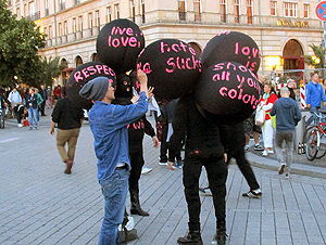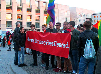 ![]() 22 Uhr: Licht an - alle Handys hoch!!! ![]() ![]() Eine Botschafts-Performance vor der Botschaft "we will never be silenced" - Banner und viele Regenbogenfahnen |