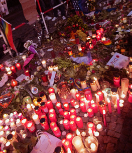 ![]() 5000 ? ![]() ![]() ![]() Die Kerzenschar wuchs vor der Amerikanischen Botschaft am Pariser Platz 49 Gedenkposter gaben den Zahlen Gesichter (Toll! - und bedrückend) Presse - online vom 18. Juni: >> siegessaeule.de/gedenken Interview mit Margot & Ryan danach.... >> tagesspiegel.de/berlin/queerspiegel/gedenken Sehr ausführlicher Bericht mit Videobeispielen >>