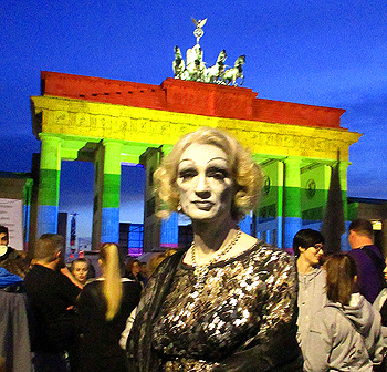 ![]() ![]() alle Fotos: BeV StroganoV Das Brandenburger Tor angestrahlt in Rainbow-Flag Manier (Ein Schild fragte: World, where is your "je suis Orlando" ?) Eigentlich sind das Fotos, die man lieber beim CSD machen würde - aber auch hier möchte Tunte Gesicht zeigen und zur Solidarität aufrufen - und trauern ! BeV und Pünktchen (in ihrem Marlene-Alter-Ego) - wir haben uns gefunden und den Weg gebahnt in der beeindruckend riesigen Menge. Mittlerweile ist man nach den Attentaten in Nizza, Würzburg, München und Ansbach nur noch Fassungslos.... Die Gedenkposter waren beim CSD in Köln und auch in Berlin auf der Straße: ![]() ![]() Die Gedenk-Poster kommen ins Schwule Museum* Berlin > Sonderseite Gay Zoo Konzert & CSD 2016 > back to Tuntenmuseum |