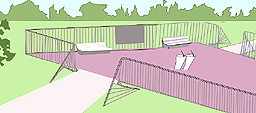 für die Öffnung des Ichs. "out of the closet - into the street!" / coming out. Matrial: Rundstangen aus Eisen, auch oben quer als Abschluss. Von Aussen sollte dies den Betrachter zuerst an einen klassischen umzäunten Park erinnern. Eventuell auch an die in Berlin typischen innerstädtischen Sportplätze. Gerade mit dem Kiesel in "Altrosa" kann es auf den ersten Blick auch wie Tennisplatz anmuten. |