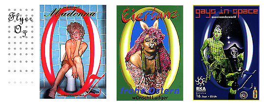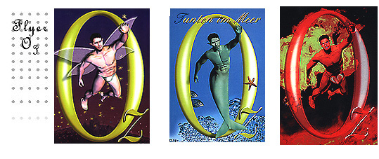 Die intensivste Zusammenarbeit waren dann die Flyer für die Oz-Parties 2000 und 2001 im BKA-Luftschloß - viele verschiedene Motive passend zu den Themen der kleinen Party-Showeinlagen. "Im Bad mit Madonna" ist da mein Liebling! Aber auch die verschiedenen Elfen fanden allgemein Anklang (zB T-unten im Meer). In diesen Jahren war es Mode möglichst bunte, wilde Flyer zu verteilen - wir stachen da durch schlichte Eleganz heraus. Oz - queerwonderworld, die Translesbischwule Party hatte auch ein sehr gemischtes buntes Publikum. |