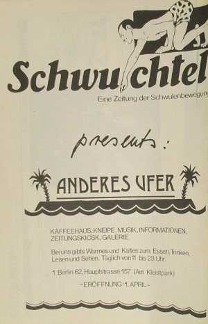 ![]() Nachruf 19951973 kam er mit seinem Freund Gerhard Hoffmann aus München nach Berlin. Vieles was uns heute selbstverständlich erscheint, mußte damals erst noch definiert, erstritten und erkämpft werden. Beide haben sich in der HAW (Homosexuelle Aktion Berlin / Gründer SchwuZ) engagiert, pflegten die Auseinandersetzung mit der zum Teil schwulenfeindlichen Linken, prägten die Diskussion über schwule Identität und und Geschichte und nahmen an zahlreichen Straßenaktionen teil.Gerade weil noch viele Schwule Angst hatten ihre Homosexualität sichtbar zu machen, setzten sich beide für das Tragen des "Rosa Winkel"-Symbols ein; auch um das Schweigen der Öffentlichkeit zu durchbrechen. In dieser Zeit veröffentlichte Reinhard erste theoretische Artikel z.B. im "Kursbuch", das von Hans Magnus Enzensberger herausgegeben wurde. Aus dieser Arbeit entstand 1975 die "Schwuchtel" als erste politische Schwulenzeitung in Deutschland. 1977 eröffnete das Redaktionskollektiv das Café "Anderes Ufer" - es war das erste offen schwule Café der Welt - selbst in San Francisco gab es nichts vergleichbares. Reinhard arbeitete im Café und schrieb weiterhin Essays und Kritiken - später auch für die Siegessäule. 1983 drehte er seinen Spielfilm "Giarres", ein Film über Liebe und Tod. Im selben Jahr veröffentlichte er das Buch "Brandenburg - Reise an den Strand eines erfundenen Meeres" Er machte Übersetzungen, z.B. "Qual und Entzücken": Gedichte von Sandro Penna, und schrieb Lieder für Salome & Ton, Steine, Scherben (mit Rio Reiser). Mehr als zehn Jahre lang organisierte und gestaltete er monatlich wechselnde Ausstellungen schwul/lesbischer Malerei und Fotografie im "Anderes Ufer". Reinhard, der die kreative Auseinandersetzung mit vielen Künstlern pflegte, war so etwas wie eine Muse der Künste. 1993 begann er selbst zu malen - seine erste Ausstellung fand 1994 in der Connection Garage statt. Reinhard von der Marwitz erreichte nur seinen 49. Geburtstag. ---------------------------------------------------------------------------------------------------------------------- Buch im web erhältlich: "Die inflationäre Struktur des Kapitalismus; das Zusammenwirken von Konzentration,Weltmarktentwicklung und Staatsintervention am Beispiel der BRD" von Aike Blechschmiedt, Gerhard Hoffmann & Reinhard von der Mariwtz - Verlag Lampertheim Kübler 1974 (auch im Kursbuch 36 / Thema: Geld, 1974 - Kursbuch 35 war: Simone de Beauvoir / Jean-Paul Sartre: Über unsere Beziehung) Laut IMDb hat er auch beim Film "Freak Orlando" von Ulrike Ottinger 1981 als Lederkerl mitgespielt. -------------------------------------------------------------------------------------------------------------------------------------------------------- 2016 erinnerten wir zu seinem vermeindlichen 70. Geburtstag an Ihn.