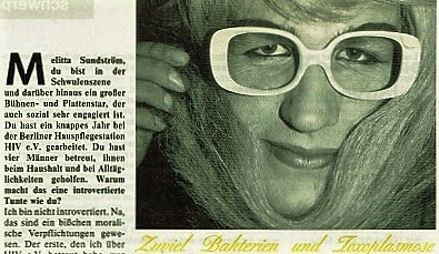 ![]() ![]() Melitta Sundström ![]() ![]() li: CSD 1987 re: Interview DAH Aktuell 1991 "Zuviel Bakterien und Toxoplasmose" |