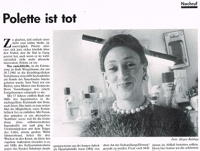 Jürgen Baldiga (* 27. Oktober 1959 in Essen; † 4. Dezember 1993 in Berlin) Koch, Musiker, Fotograf, Darsteller und Regisseur. Als Tunte "Praktica" bei Ensemble Les Tuxxx Mehrere Ausstellungen und Buchveröffentlichungen: Bambule, Queens-Tunten-Tantes, Etwas besseres als den Tod finden wir allemal ... ![]() ![]() Hanni, Erika, Paula, Gaby, Tamara, Renate, Ovo, Praktica, Ilse Alle Fotos von Jürgen sind Copyright : Schwules Museum* Berlin |