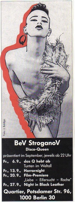![]() ![]() BeV & Jürgen im Film "Liebe, Eifersucht & Rache" von Michael Brynntrup, 1991 >> vimeo.com 7 min. (BeV telefoniert als er und sie mit sich selbst/ Vollplayback) Ganz aktuell am 19. Mai 2016 bei der xposed Filmparty, Südblock Berlin (Bev im Originalkostüm erinnerte an Jürgen) ![]() Michael hat auch noch Originalfilme die Jürgen gedreht hat, man wartet noch auf finanzielle Unterstützung um sie zu digitalisieren !!! weitere Zusammenarbeit mit BeV: ![]() ![]() ![]() BeV: Postcard & Ausstellungskalender 1991: "...dann mach ich es mir eben selbst!" Jürgen Baldiga: Fotosession Januar 1991 im "Dragstore" Tuntenmodeladen ![]() aus meinem Archiv (heute mit Konvolut im Archiv Humbold-Universität) |